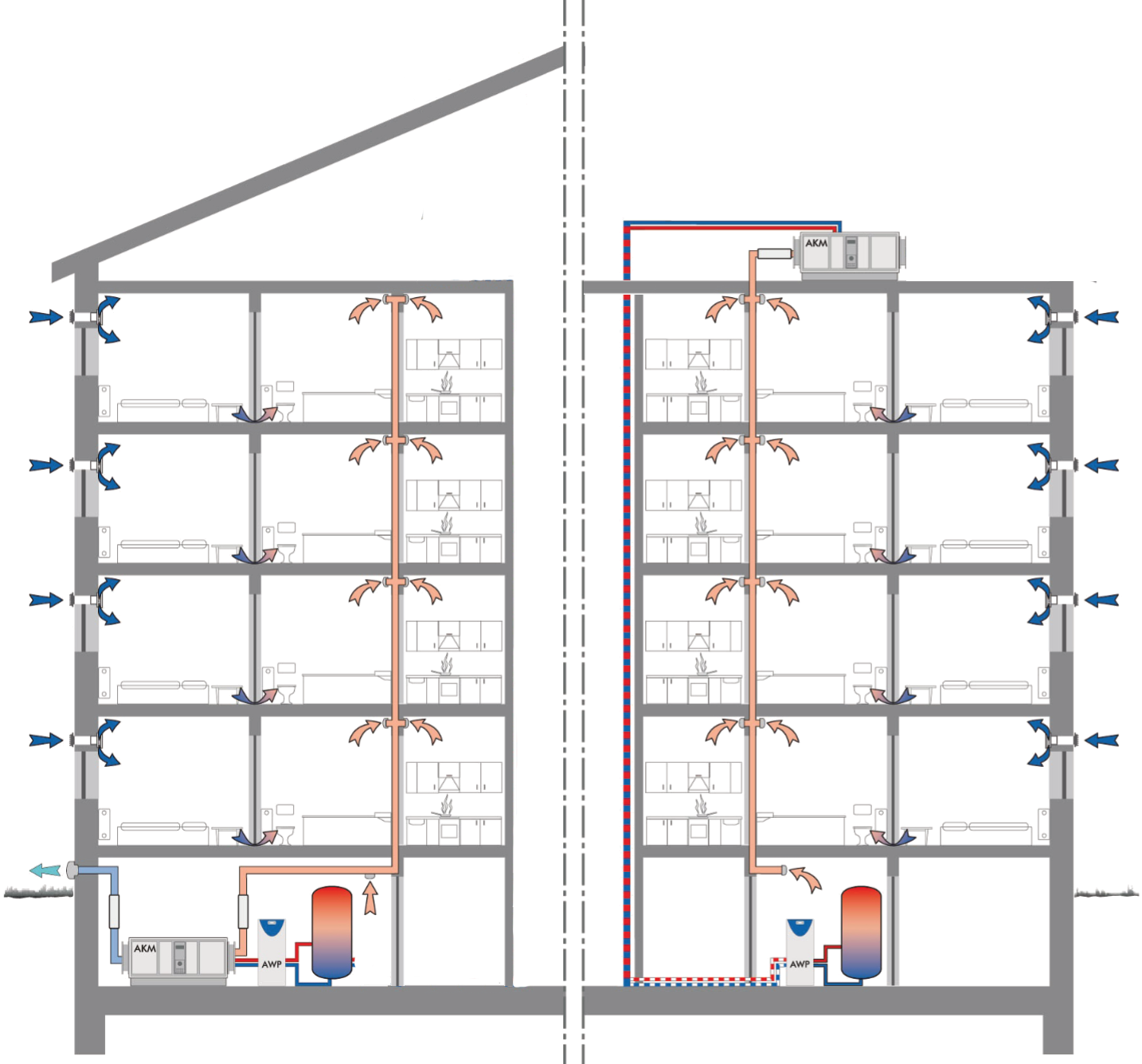 Die abgesaugte Luft wird für das ganze Gebäude gesammelt. Im AKM wird ihr die Energie entzogen und diese mittels einer Abluftwasserwärmepumpe auf ein höheres Energieniveau gepumpt. Diese Wärme wird wieder in den vorhandenen Pufferspeicher zurückgegeben.