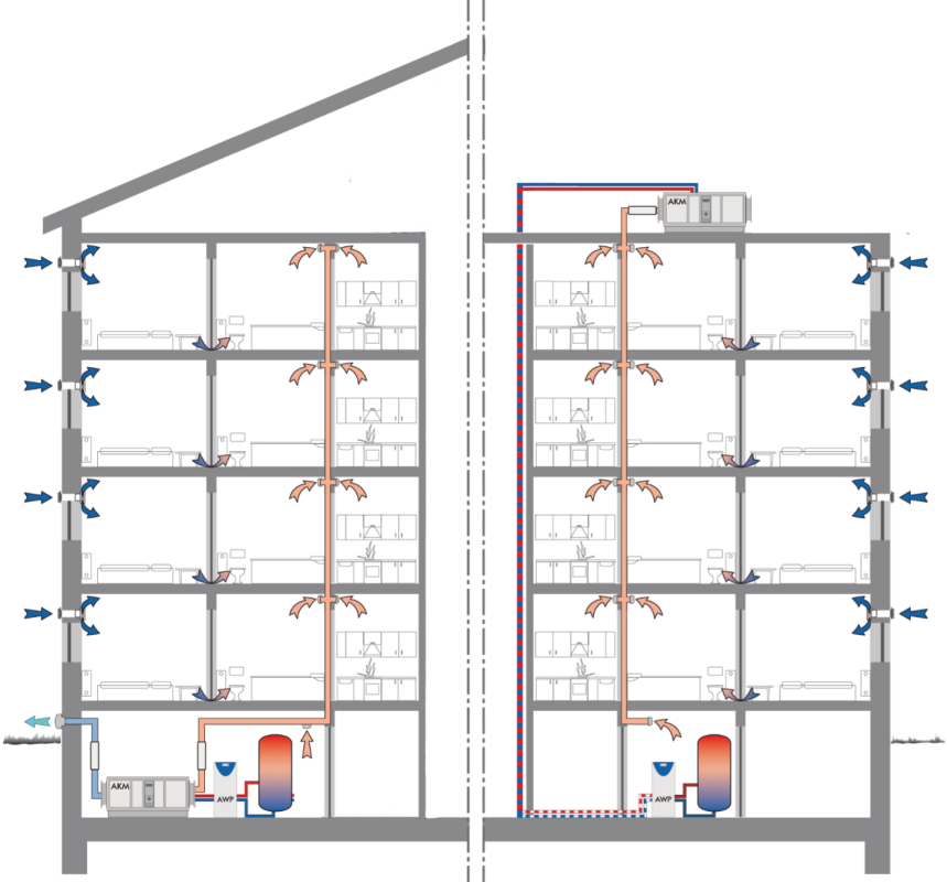 Die abgesaugte Luft wird für das ganze Gebäude gesammelt. Im AKM wird ihr die Energie entzogen und diese mittels einer Abluftwasserwärmepumpe auf ein höheres Energieniveau gepumpt. Diese Wärme wird wieder in den vorhandenen Pufferspeicher zurückgegeben.